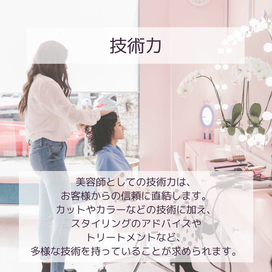 - スタイリストとしての技術力は、お客様からの信頼に直結します。カットやカラーなどの技術に加え、スタイリングのアドバイスやトリートメントなど、多様な技術を持っていることが求められます。