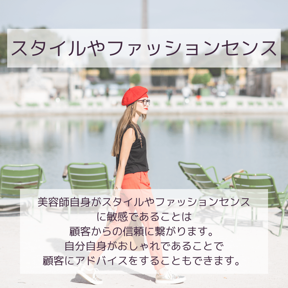 - スタイリスト自身がスタイルやファッションセンスに敏感であることは、お客様からの信頼に繋がります。自分自身がおしゃれであることで、アドバイスをすることもできます。