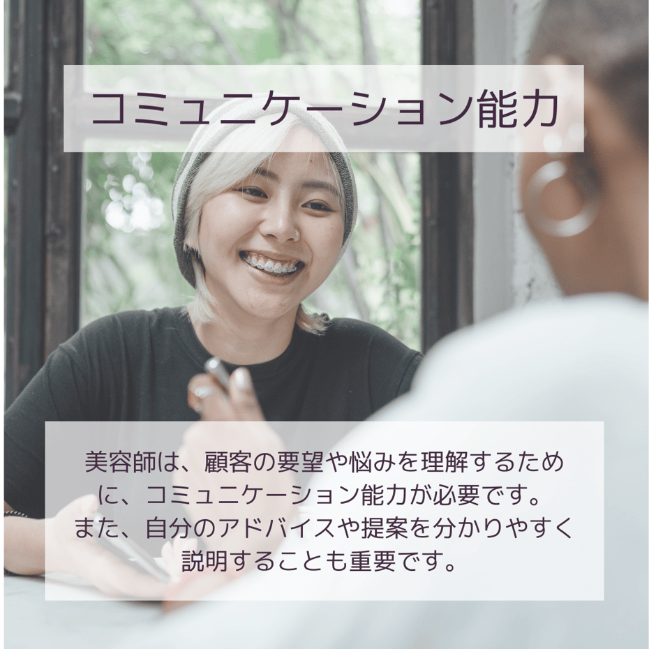 - スタイリストは、お客様の要望や悩みを理解するために、コミュニケーション力が必要です。また、自分のアドバイスや提案を分かりやすく説明することも重要です。