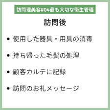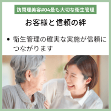 施設やご自宅に訪問するときの衛生管理は器具・用具の消毒はもちろん、訪問時にもお客様の健康状態やの様子を確認しましょう。